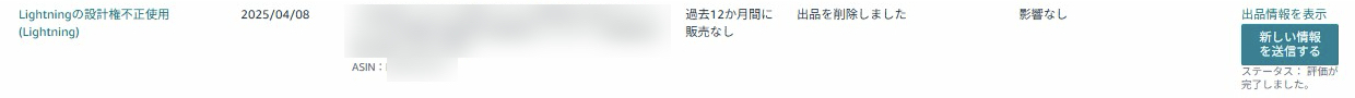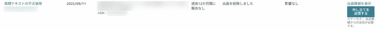 ほとんどの場合は「影響なし」になりますが、販売履歴のある商品の場合は「中-違反が繰り返されました」と表示され20点ほど引かれる場合があります。