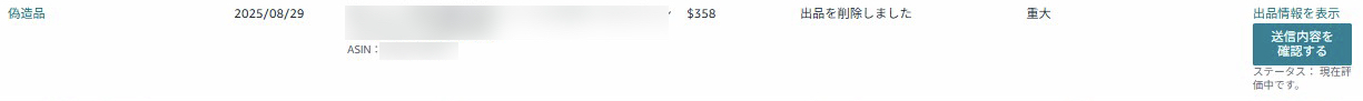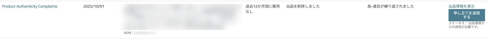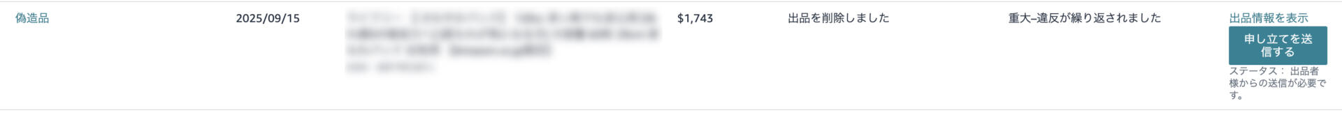 これはメーカーに偽造品を指摘された場合や、カスタマーレビュー違反、出品者利用規約および出品者行動規範などが該当します。