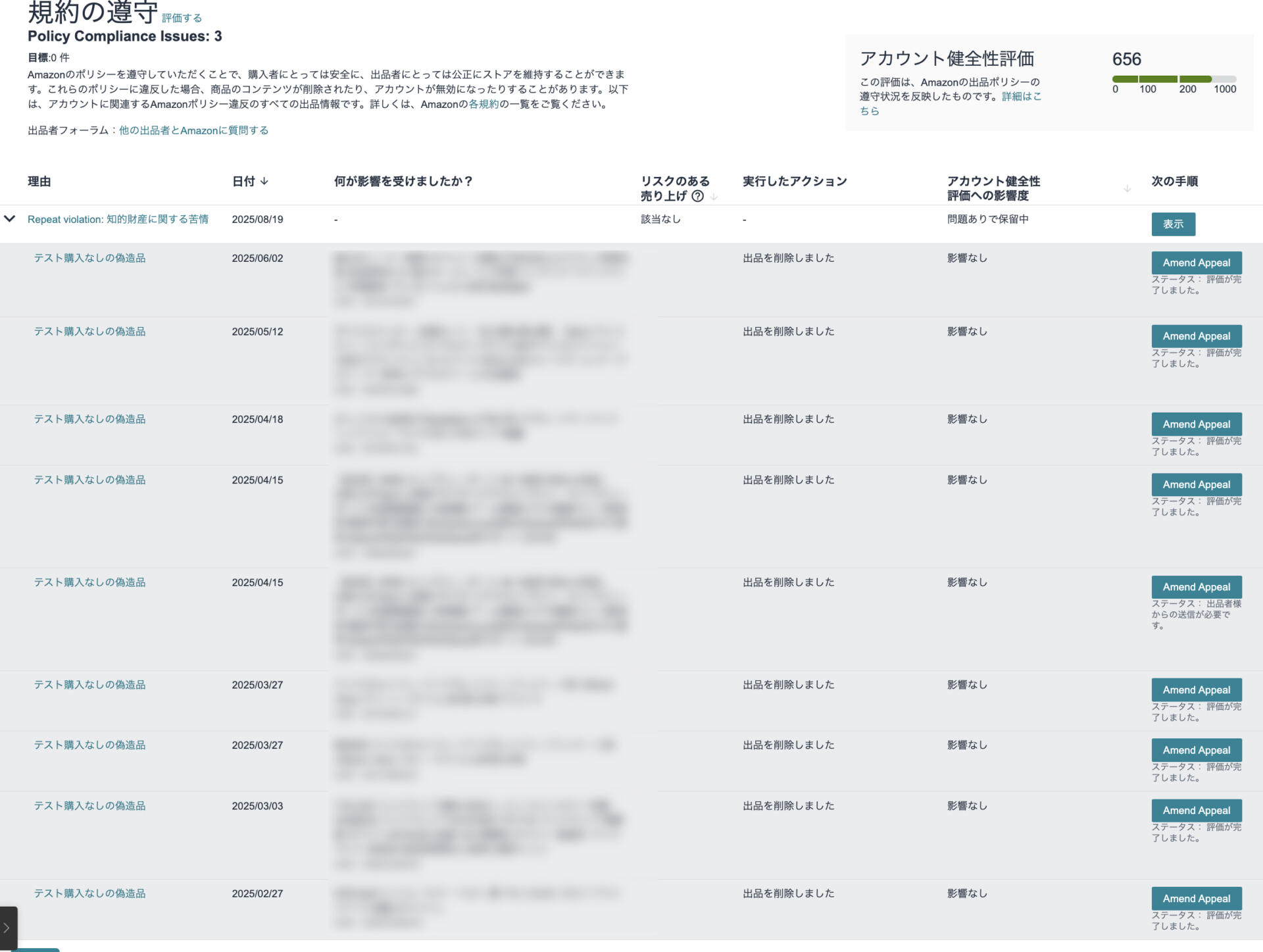 ご利用の出品用アカウントに関連した1つ以上のポリシーへの違反が繰り返し発生しているため、このような措置を講じました。