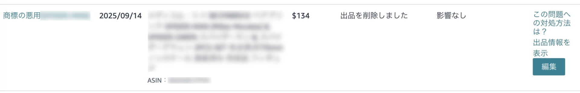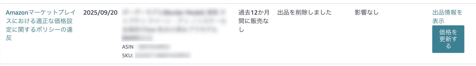 出品価格が平均値より大幅に異なっている場合に発生します。ただ価格変更や商品情報削除で違反も消え、影響度も「影響なし」なので、あまり気にする必要はありません。
