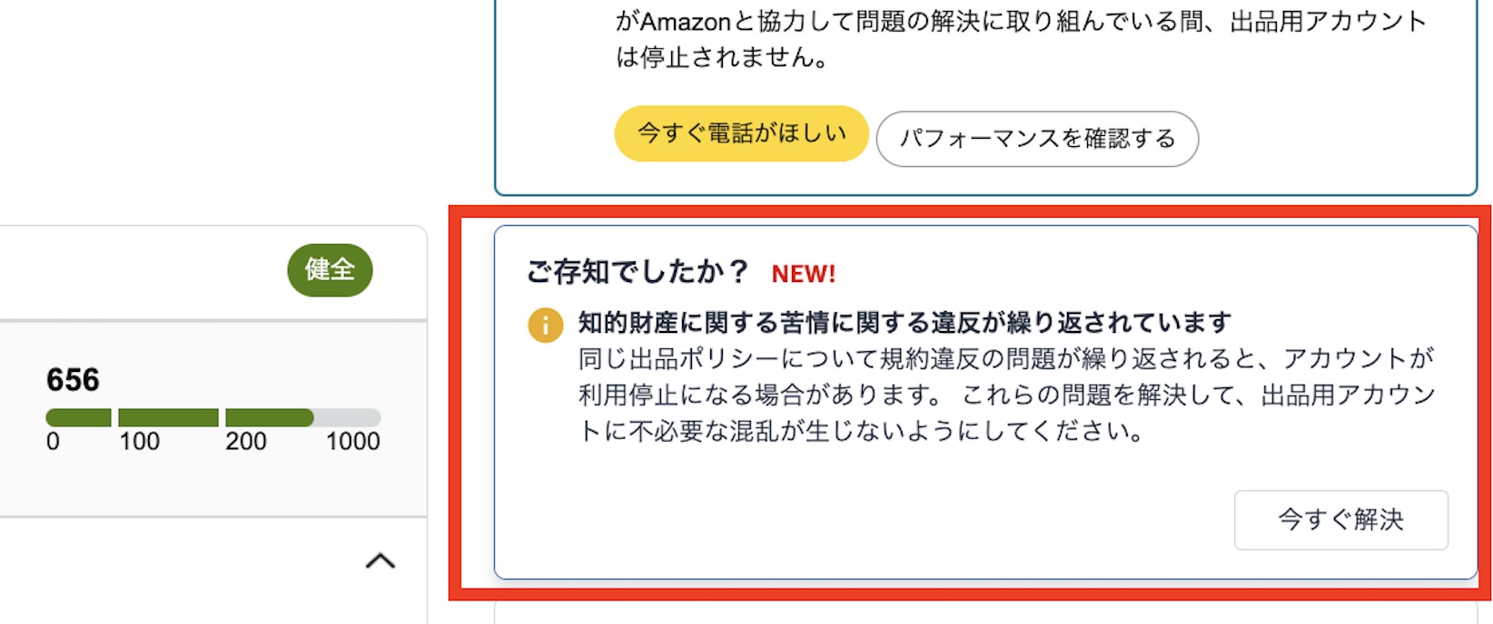 ご利用の出品用アカウントに関連した未対応のポリシー違反があり、それらの違反によってアカウント健全性評価がアカウントの利用停止のしきい値を下回ったため、このような措置を講じました。