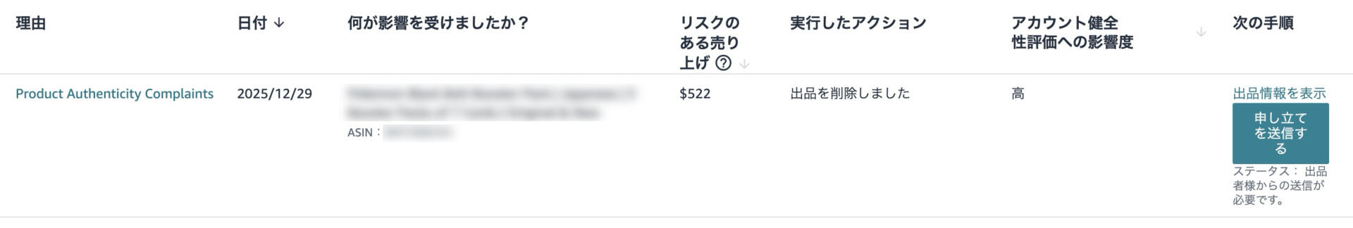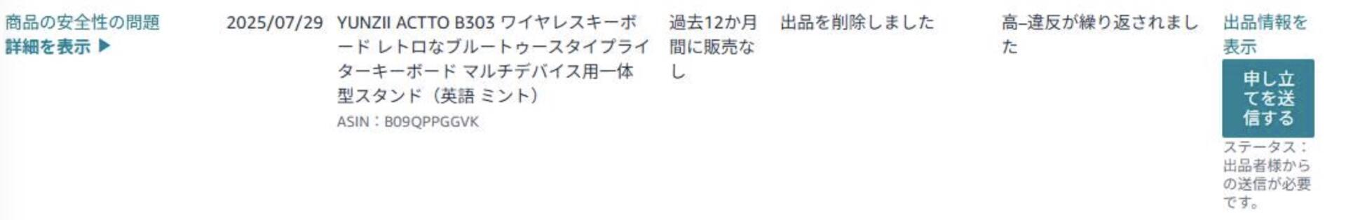 ご利用の出品用アカウントに関連した1つ以上のポリシーへの違反が繰り返し発生しているため、このような措置を講じました。