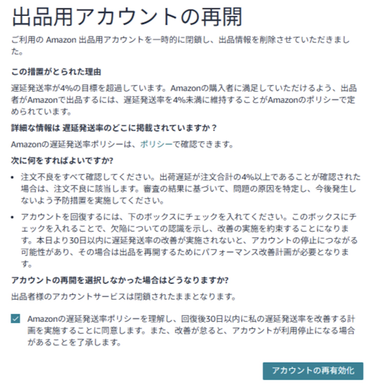 *出荷遅延などのパフォーマンス悪化は、アカウント停止ではなく出品者出荷の停止という特殊な停止になります。