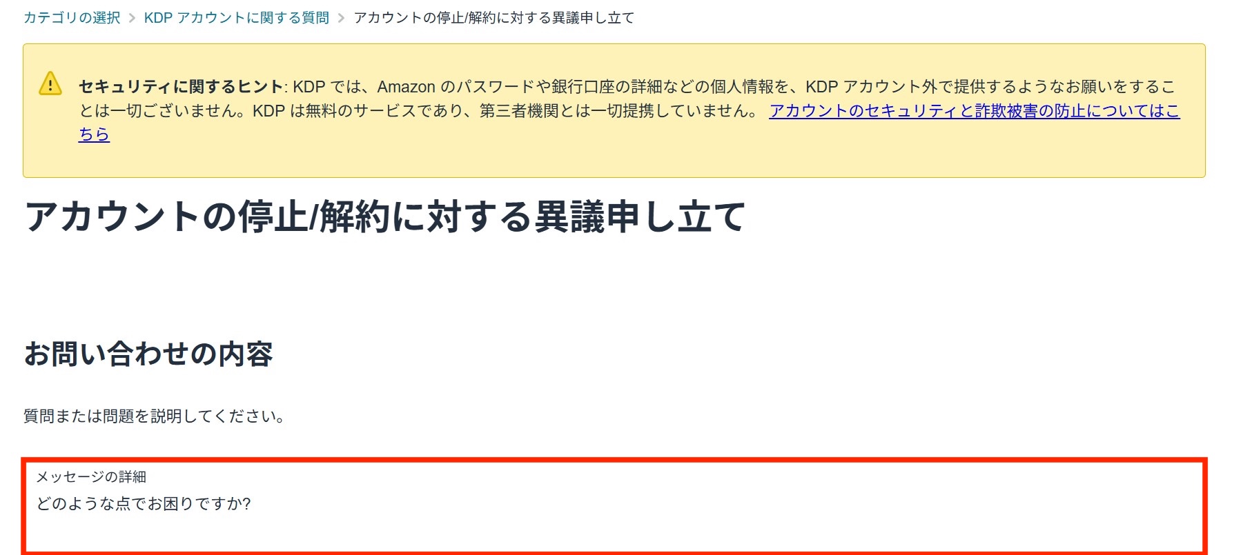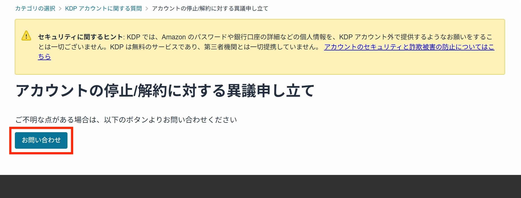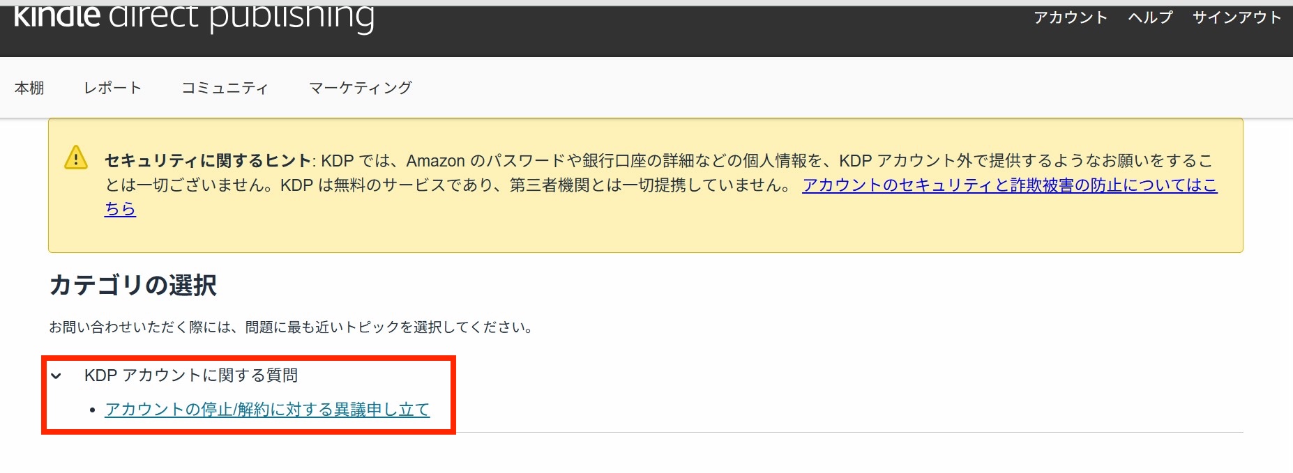 KDPアカウントにログインできる場合は、アカウントが停止状態であっても、管理画面からKDPサポートへ直接連絡することが可能です。