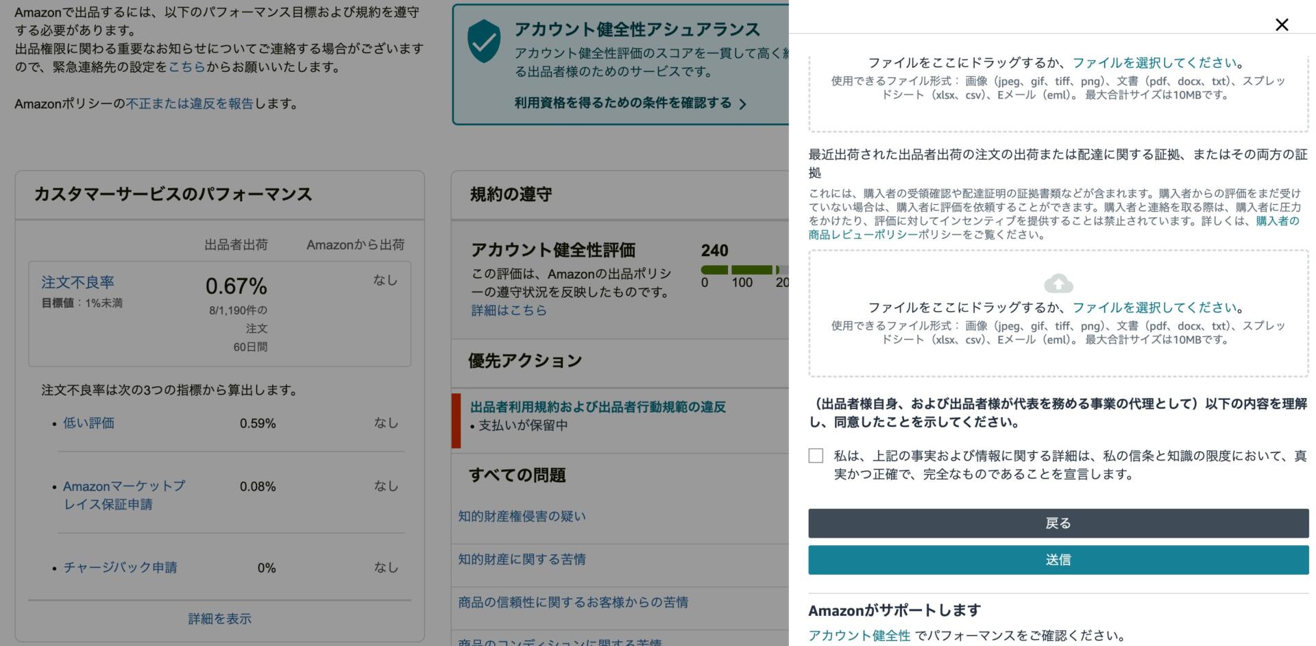 — ご利用のアカウントが Amazon の「出品者利用規約および出品者行動規範」を遵守していることを示す証拠または実例。