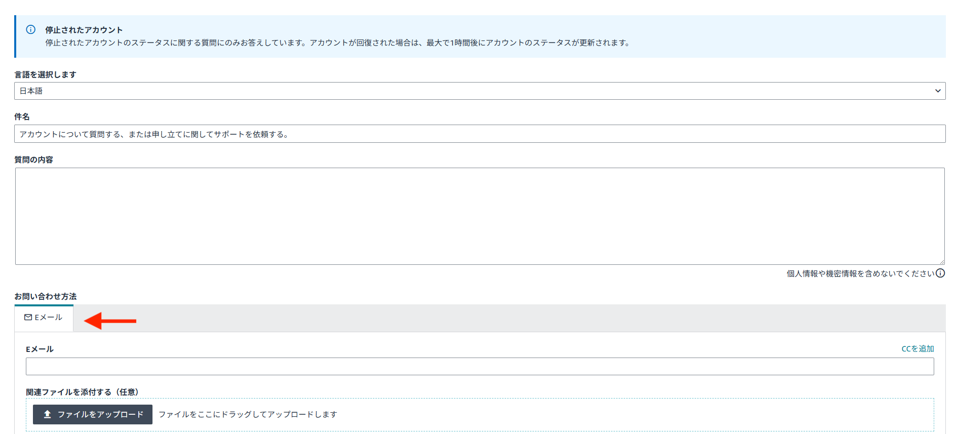 突然アカウント停止メールが届き、上に赤枠で申し立てフォームが出現するのみです。アカウントを再開させるためには右上の「新しい情報を送信する」ボタンを押して申し立てを進めていく必要があります。