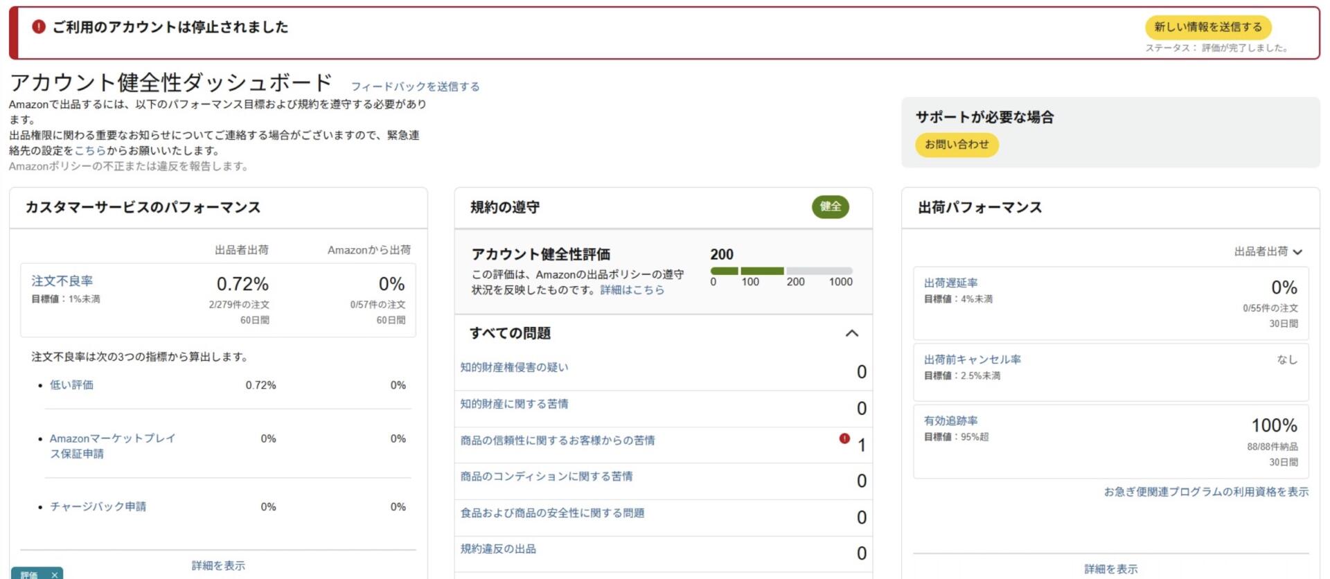 ご利用のAmazon出品用アカウントを一時的に閉鎖し、出品情報を削除させていただきました。