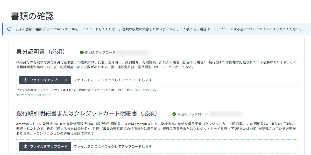 フォームにしたがって、それぞれ身分証明書と銀行取引明細書またはクレジットカード明細書を添付します。