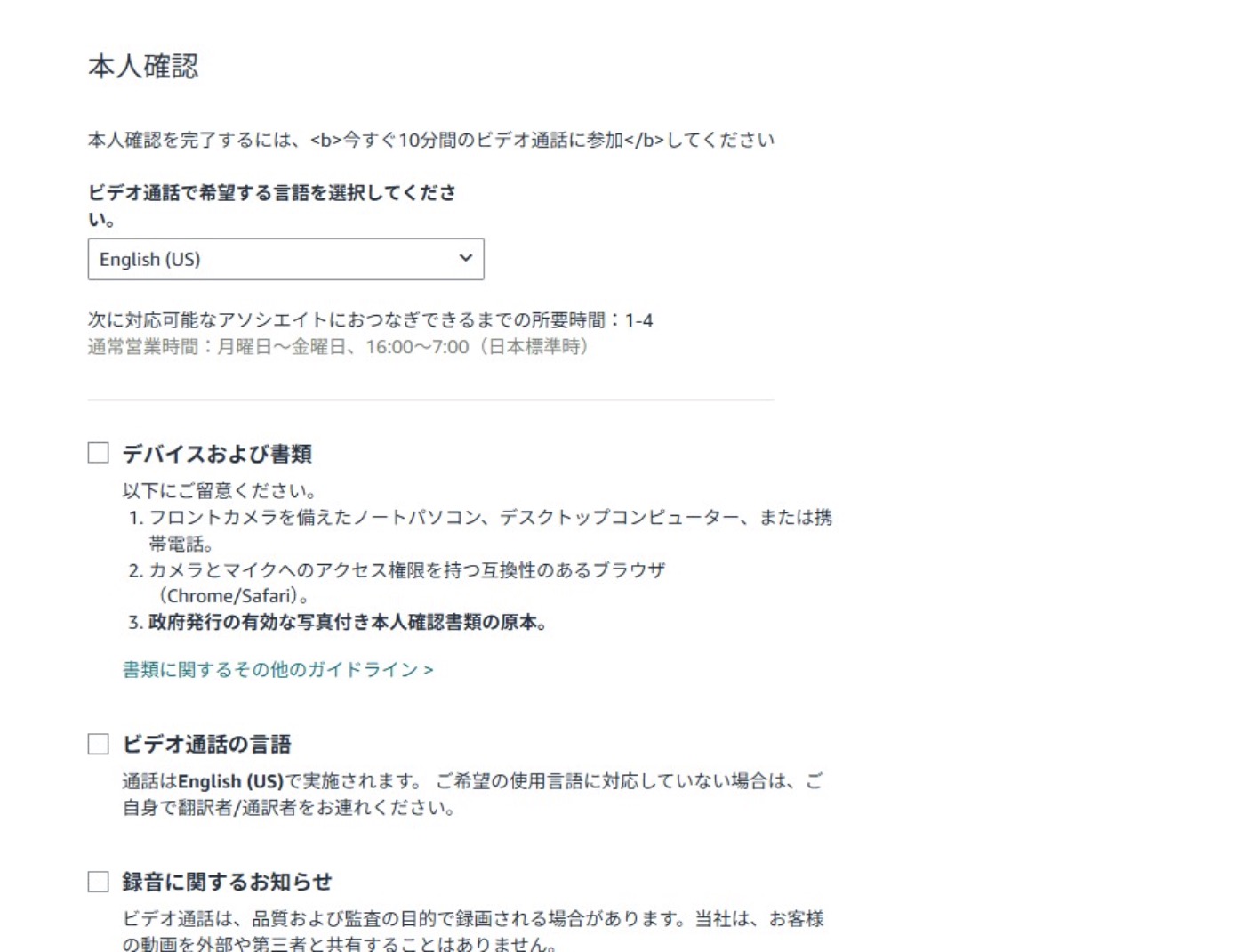 ビデオによる確認を実施中に技術的な問題やお困りの点がございましたら、「バーチャル本人確認:トラブルシューティングガイド」をご覧ください。